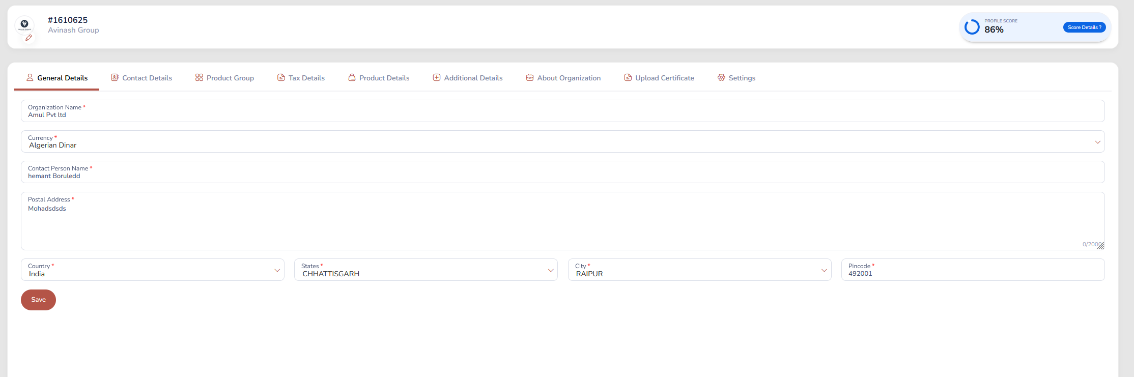 Step 2: Review and update your details as needed. You can change your general details, contact details, product group, tax details, product details, additional details, about organization, upload certificates, and settings.