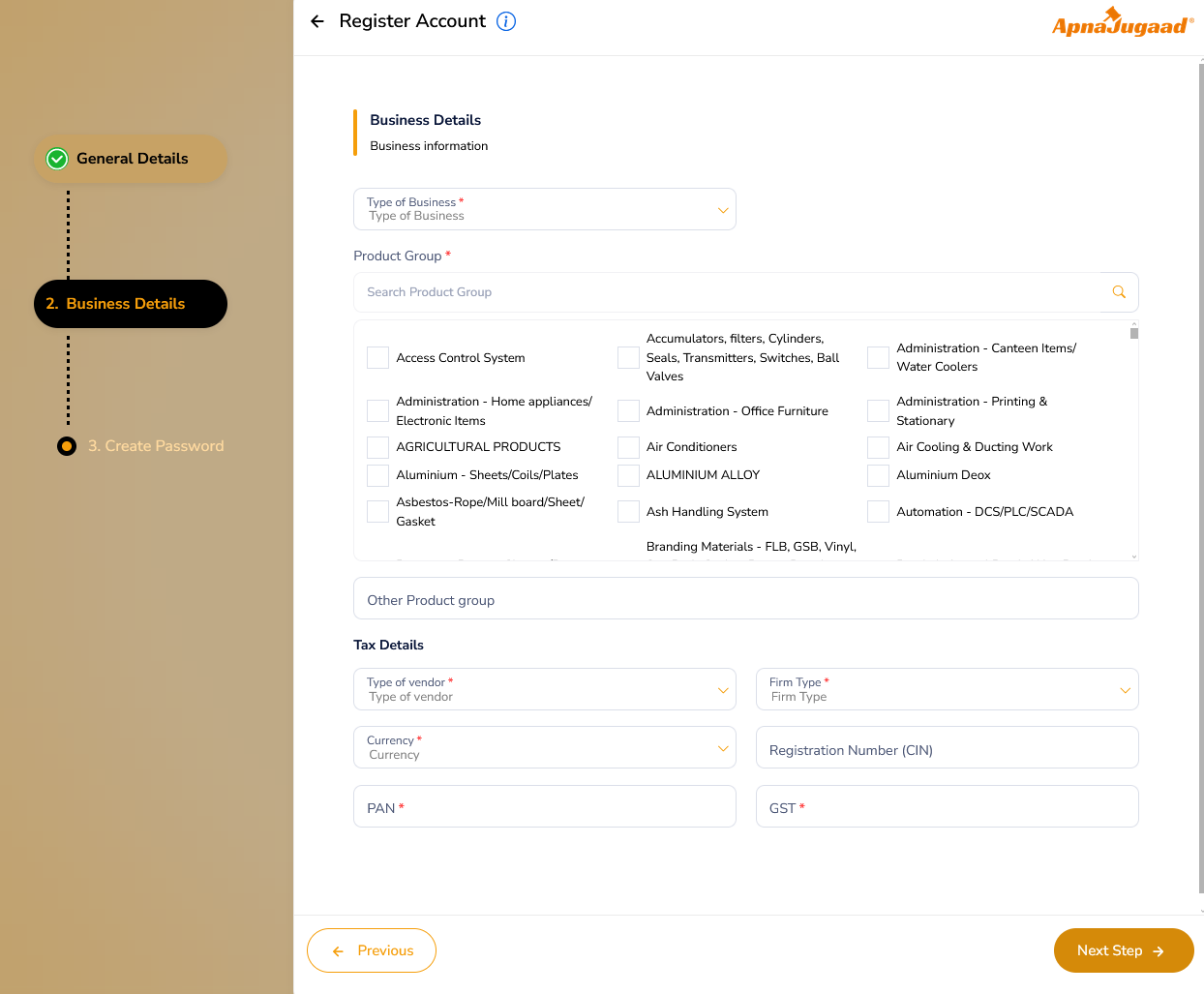 (III) Tax Details: This section is for providing your official government-issued business identifiers. Providing your Registration Number (CIN), PAN (Permanent Account Number), and GST (Goods and Services Tax) details is a standard legal and financial requirement for business transactions in India. This information ensures that all purchases and transactions made through the portal are compliant and correctly recorded.