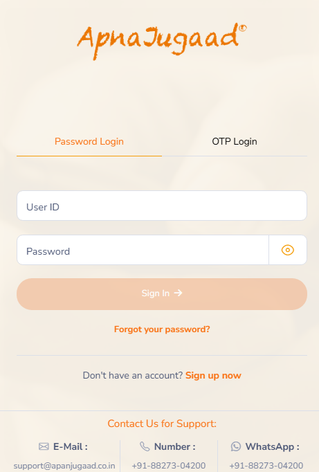 1. Navigate to the Login Page: Go to the official ApnaJugaad Login page "https://v3.apnajugaad.co.in/auth".