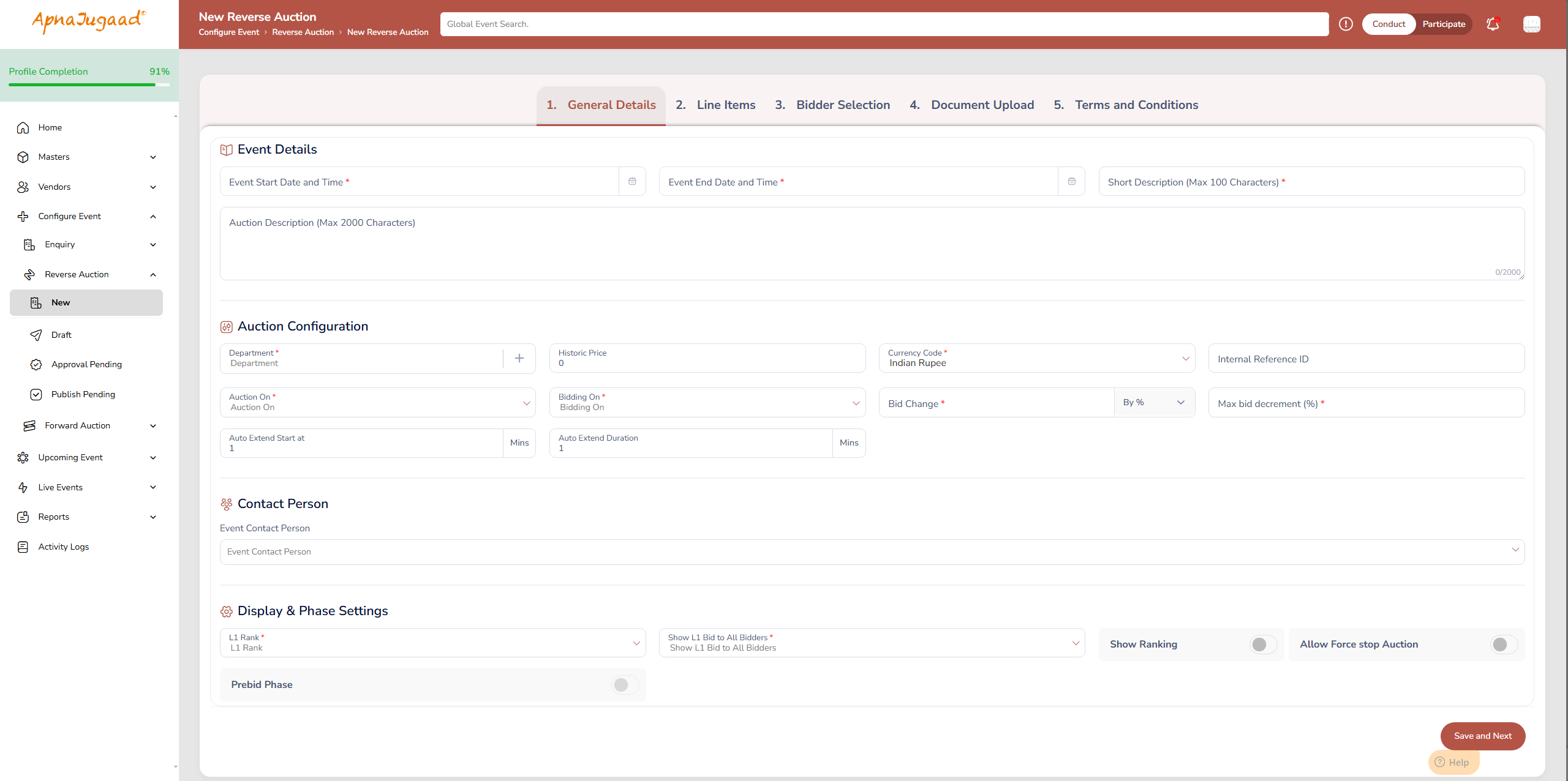 (I) L1 Rank & Show L1 Bid to All Bidders: 'L1' is procurement terminology for "Lowest Price, Rank 1"—the current winning position. This setting determines the level of transparency in your auction, which has significant psychological impacts on bidders.