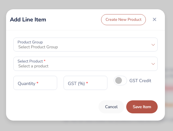 Click on the ‘Add Line Item’ button. Select the relevant Product Group, then choose the Product, enter the Quantity, and specify the applicable GST Percentage.